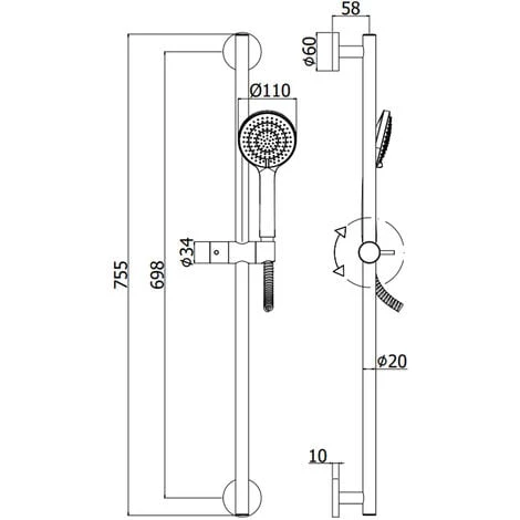 Barre de douche élégante avec tige métallique ronde d’un diamètre de 20 mm et d’une longueur de 755 mm. La barre coulissante proposée est entièrement en métal et est livrée complète avec supports muraux fixes, support de douche coulissant, douche ronde ABS 3 jets (diam. 110 mm) et flexible PVC argent 1500 mm avec capuchon conique orientable.
